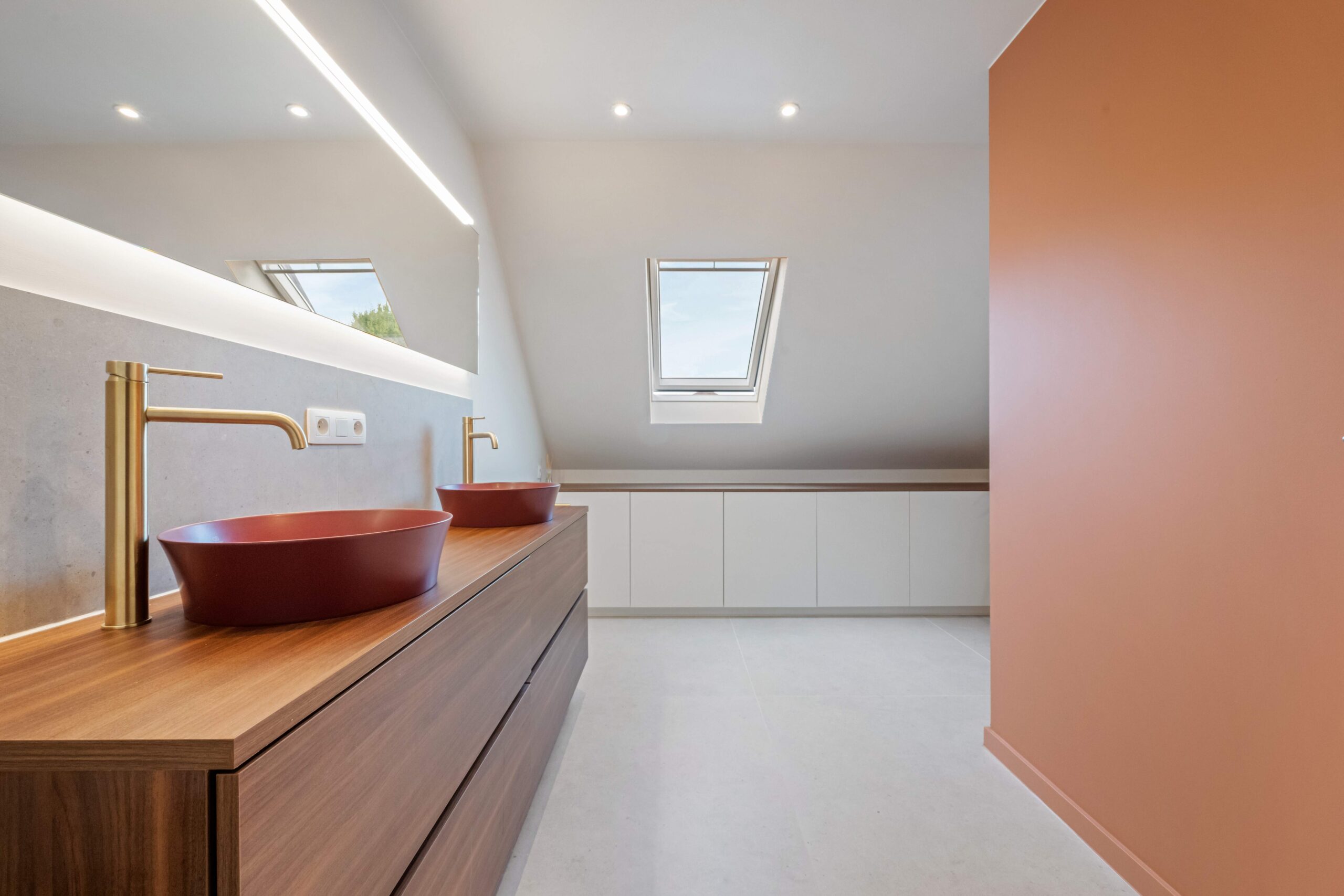 Onder de schuine dakwand werden ingemaakte kasten op maat geplaatst, waardoor elke centimeter efficiënt benut wordt en de badkamer zowel stijlvol als praktisch blijft.