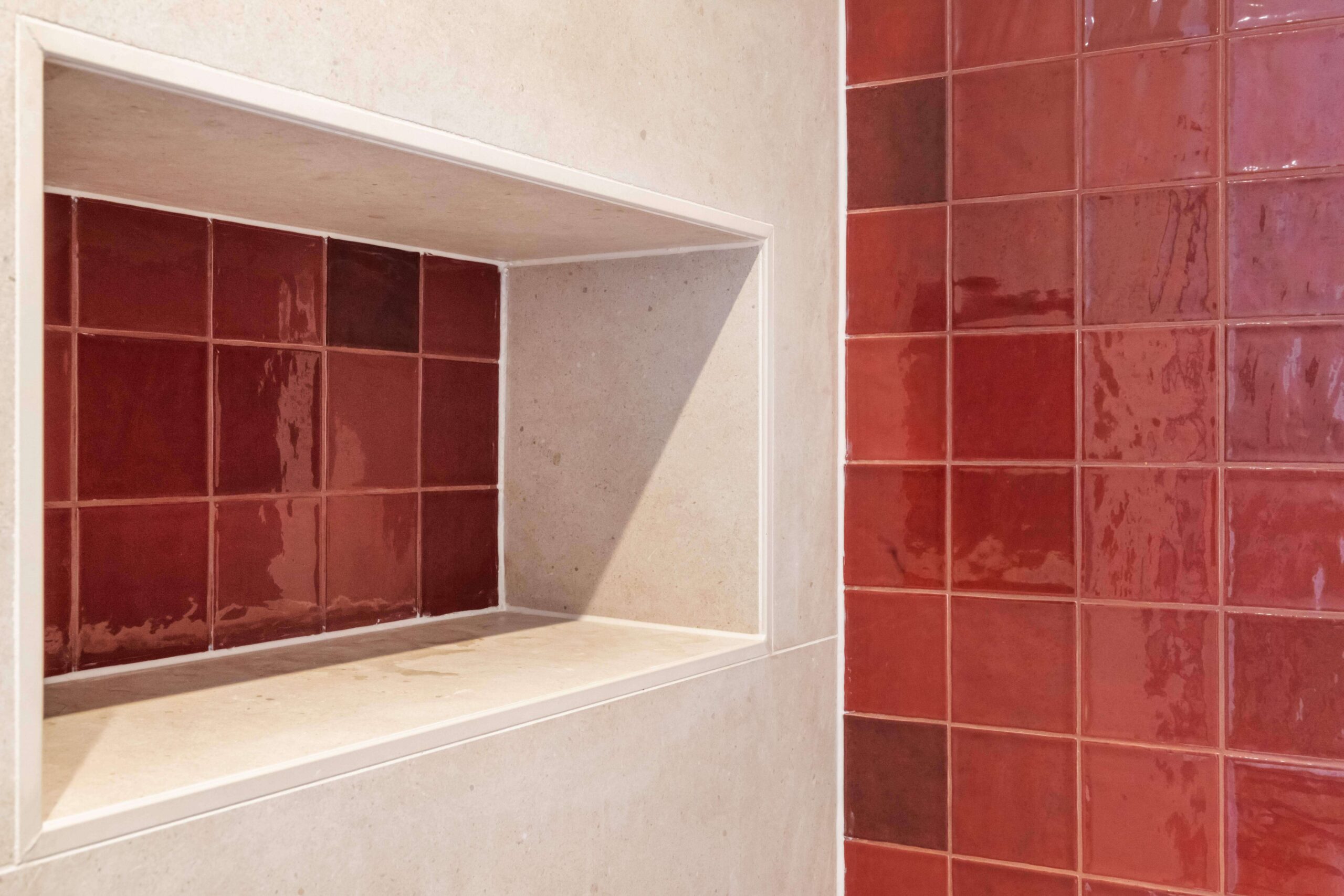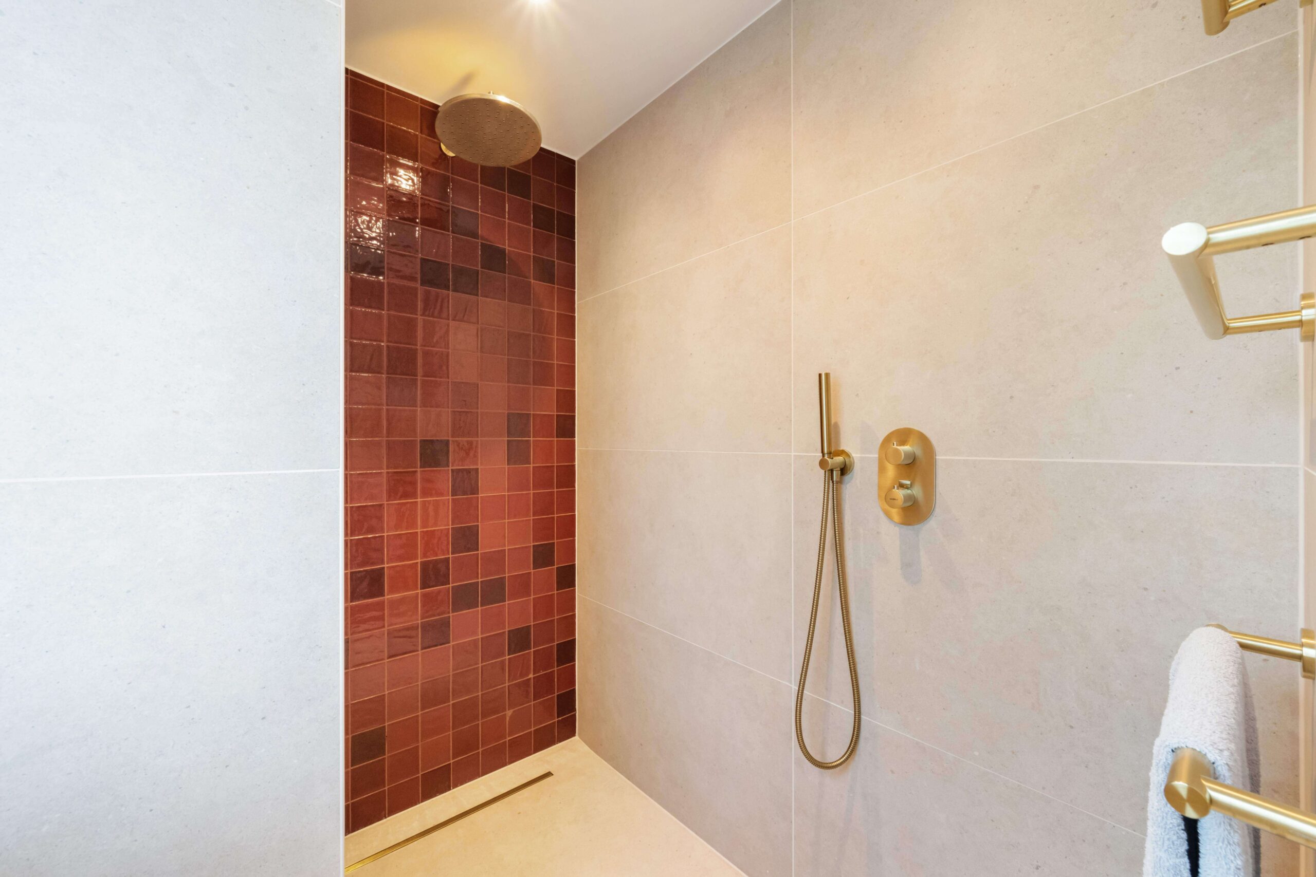 Deze badkamerrenovatie straalt warmte en luxe uit dankzij het gebruik van diepe tinten oranje en rood in zowel de tegels als de lavabo’s. Het koperkleurige kraanwerk en het badkamermeubel in een diep oranjekleurige houtsoort versterken de rijke uitstraling en brengen een harmonieus geheel.