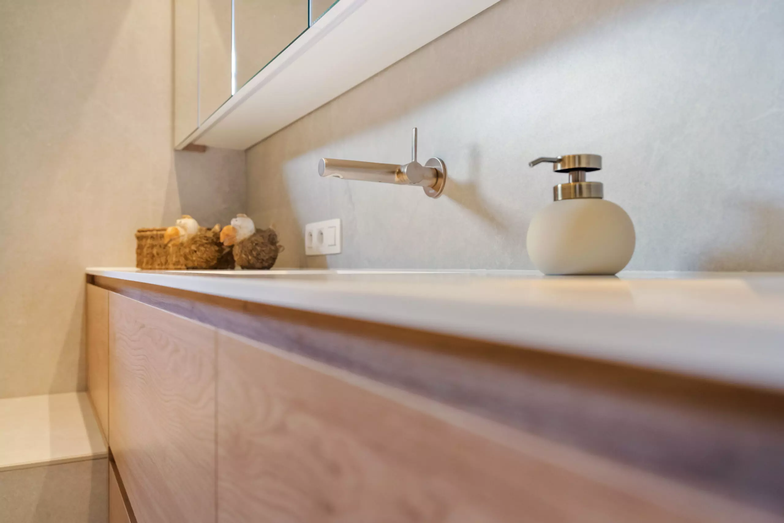 Het lavabomeubel en de spiegelkast zijn volledig op maat ontworpen, met keuzevrijheid in kleur, materiaal en indeling. Het werkblad met geïntegreerde wastafels is uitgevoerd in solid surface (Corian).