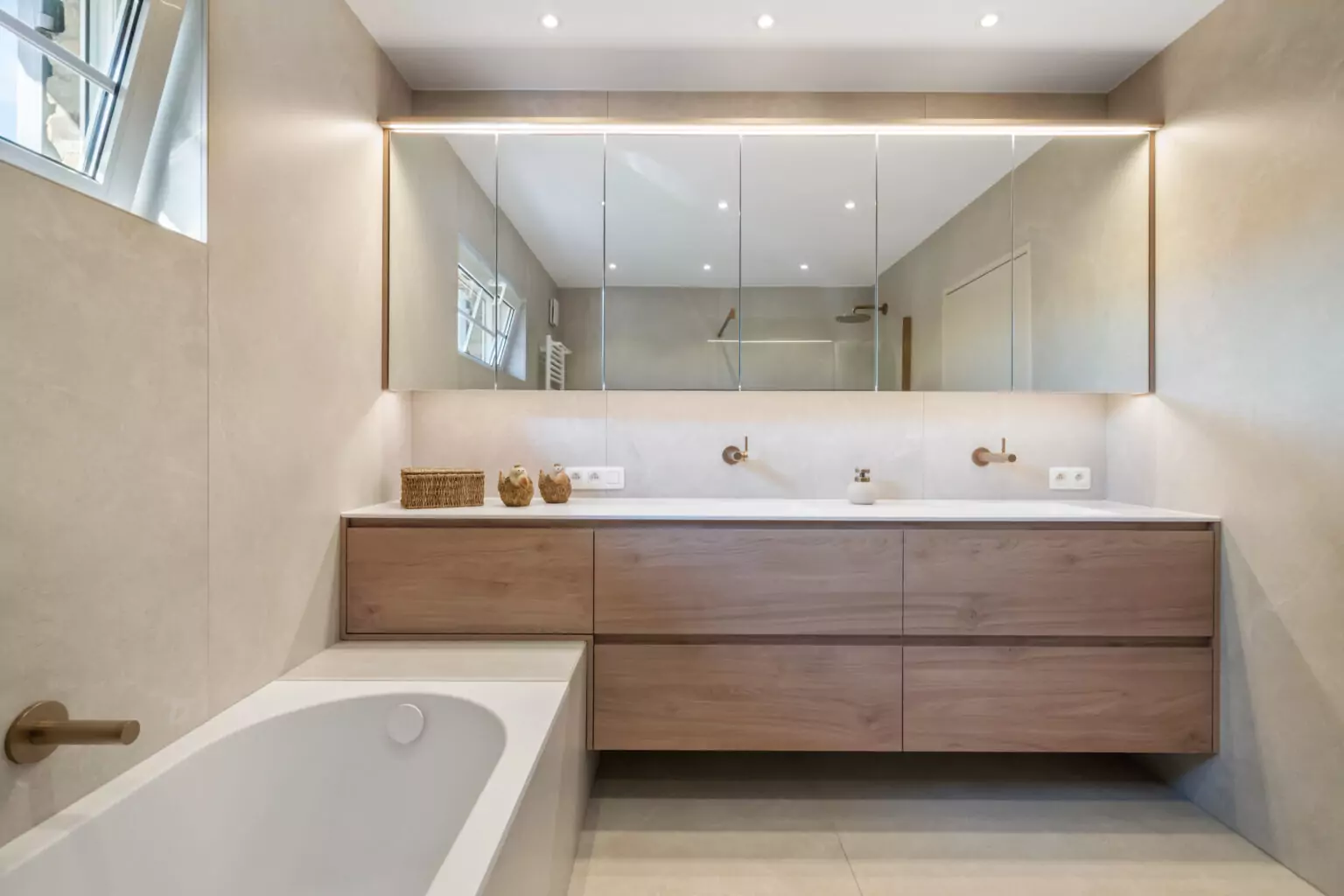 Brushed bronze inbouwkranen en accessoires combineren prachtig met de XXL keramische tegelplaten. Strategisch geplaatste ledverlichting – boven en onder de spiegelkast én in de nis van de douche – voegt extra warmte en sfeer toe.