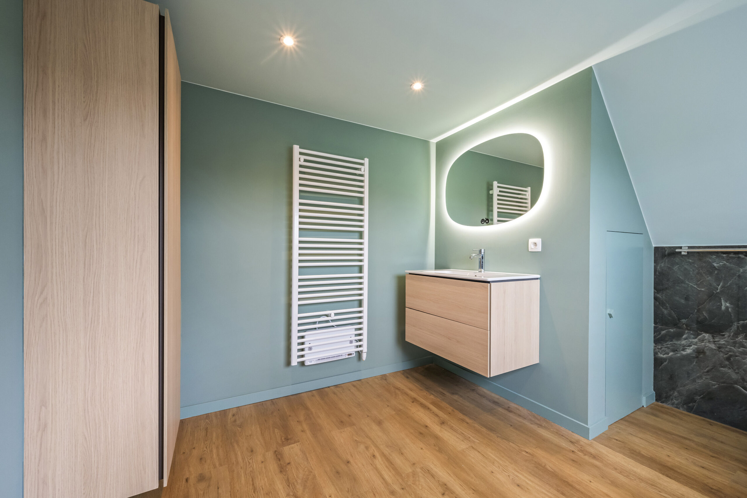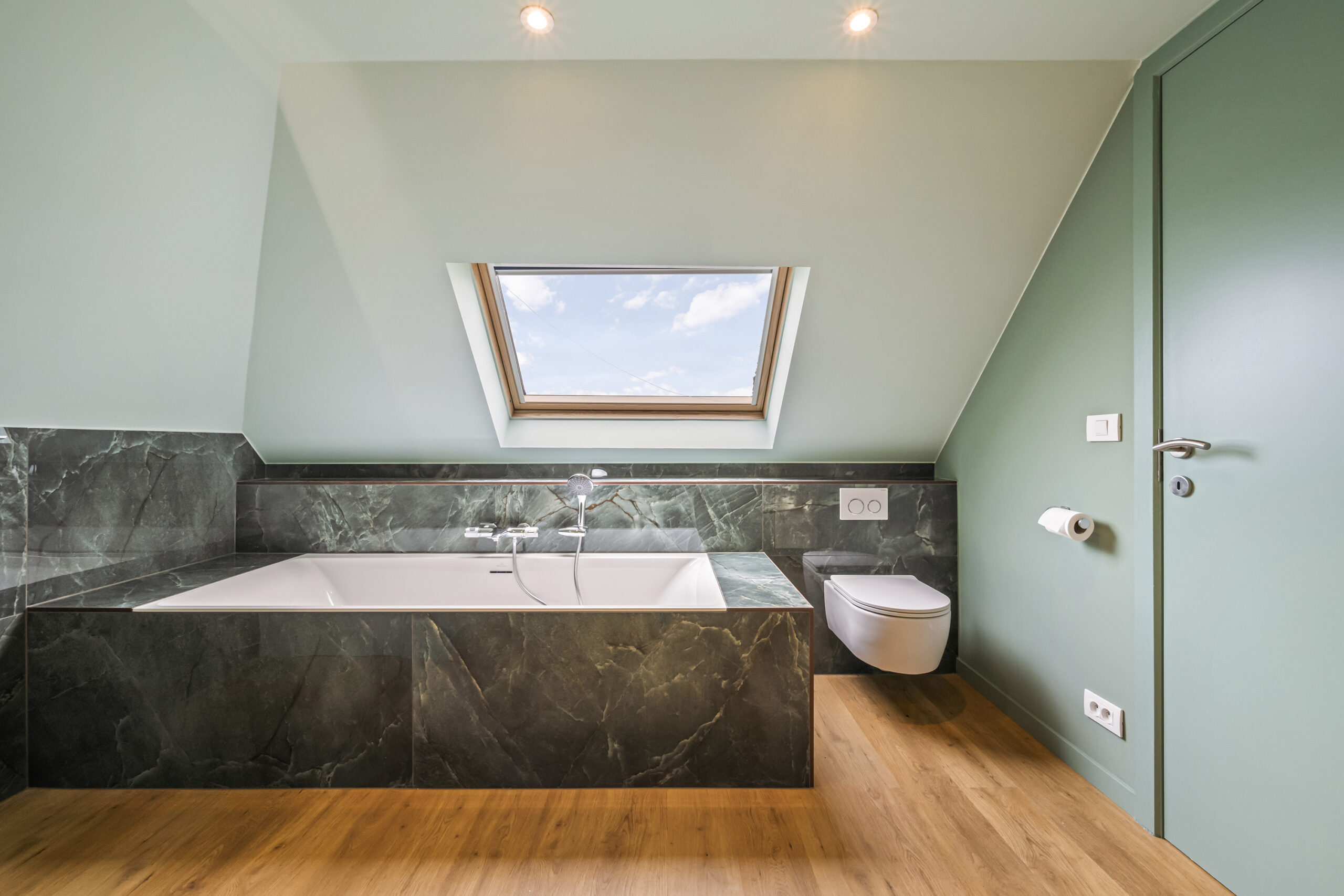 Met een ongebruikte zolderruimte als vertrekpunt werd een volledig nieuwe badkamer gecreëerd, inclusief een comfortabel ligbad. De vele schuine dakwanden vormden een uitdaging, maar dankzij slim geplaatste valse wanden werd de ruimte optimaal bruikbaar. Zelfs de waterboiler werd volledig weggewerkt, waardoor de badkamer een strak en rustig geheel vormt.