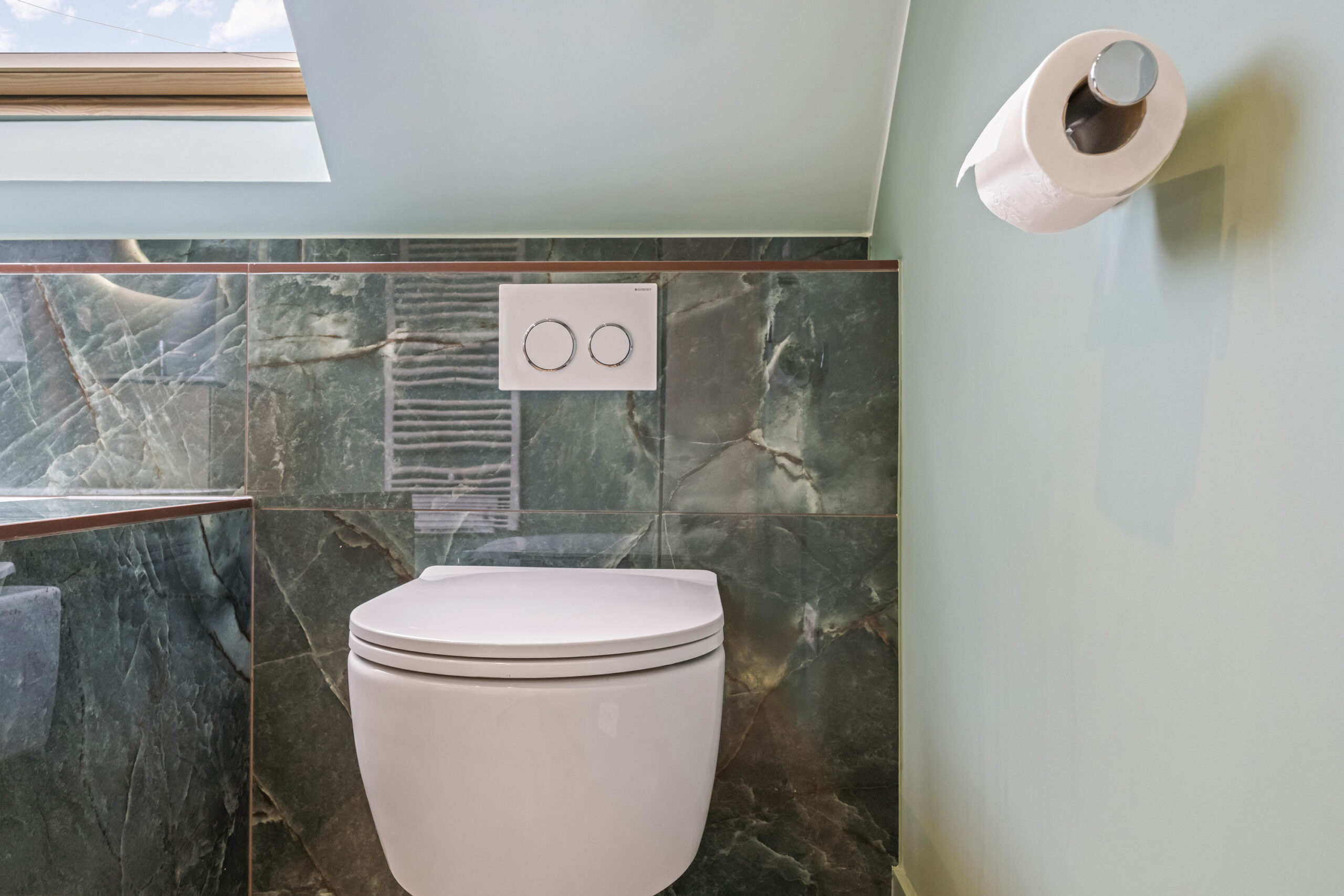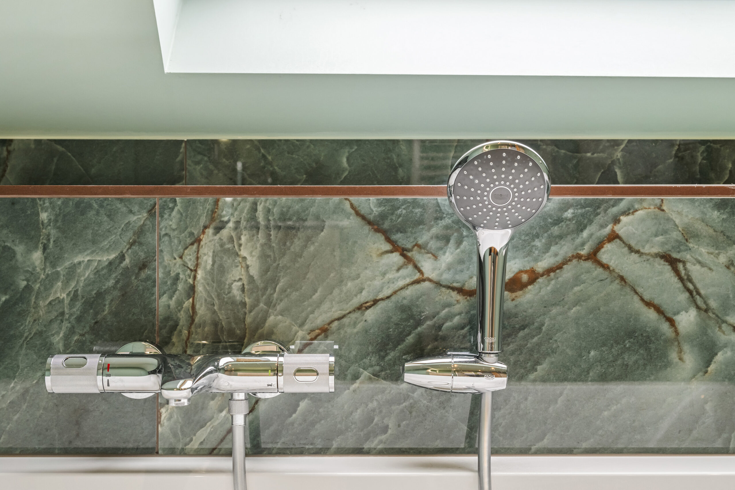De muren kregen een groene tint, gecombineerd met grootformaat tegels in een verfijnde marmerlook. Deze tegels zijn nauwelijks te onderscheiden van echte natuursteen, maar vragen veel minder onderhoud. Het groen zorgt voor een natuurlijke, frisse sfeer met een vleugje luxe.