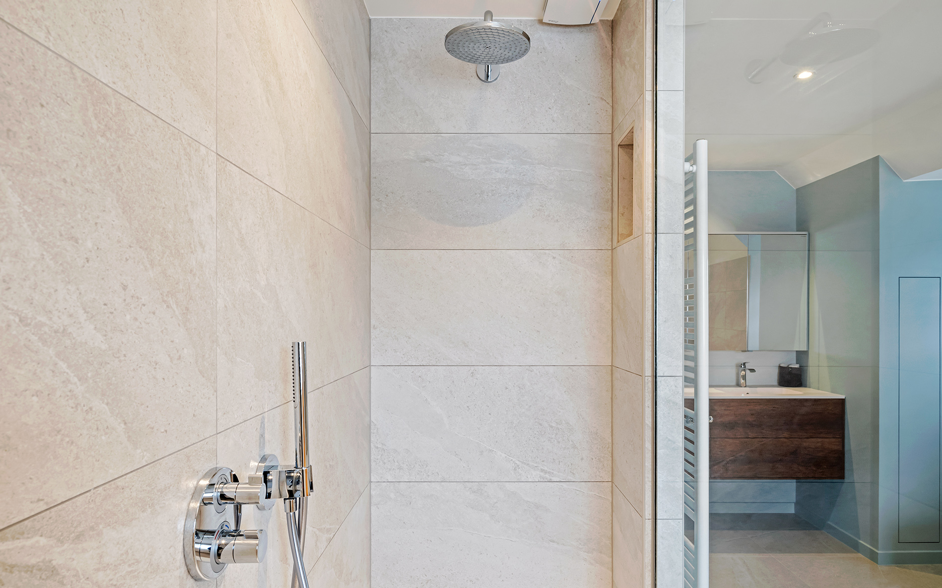 De inloopdouche is ruim en breed ontworpen voor optimaal comfort. In de douchewand werd een handige nis verwerkt om douchegel en shampoo netjes op te bergen.