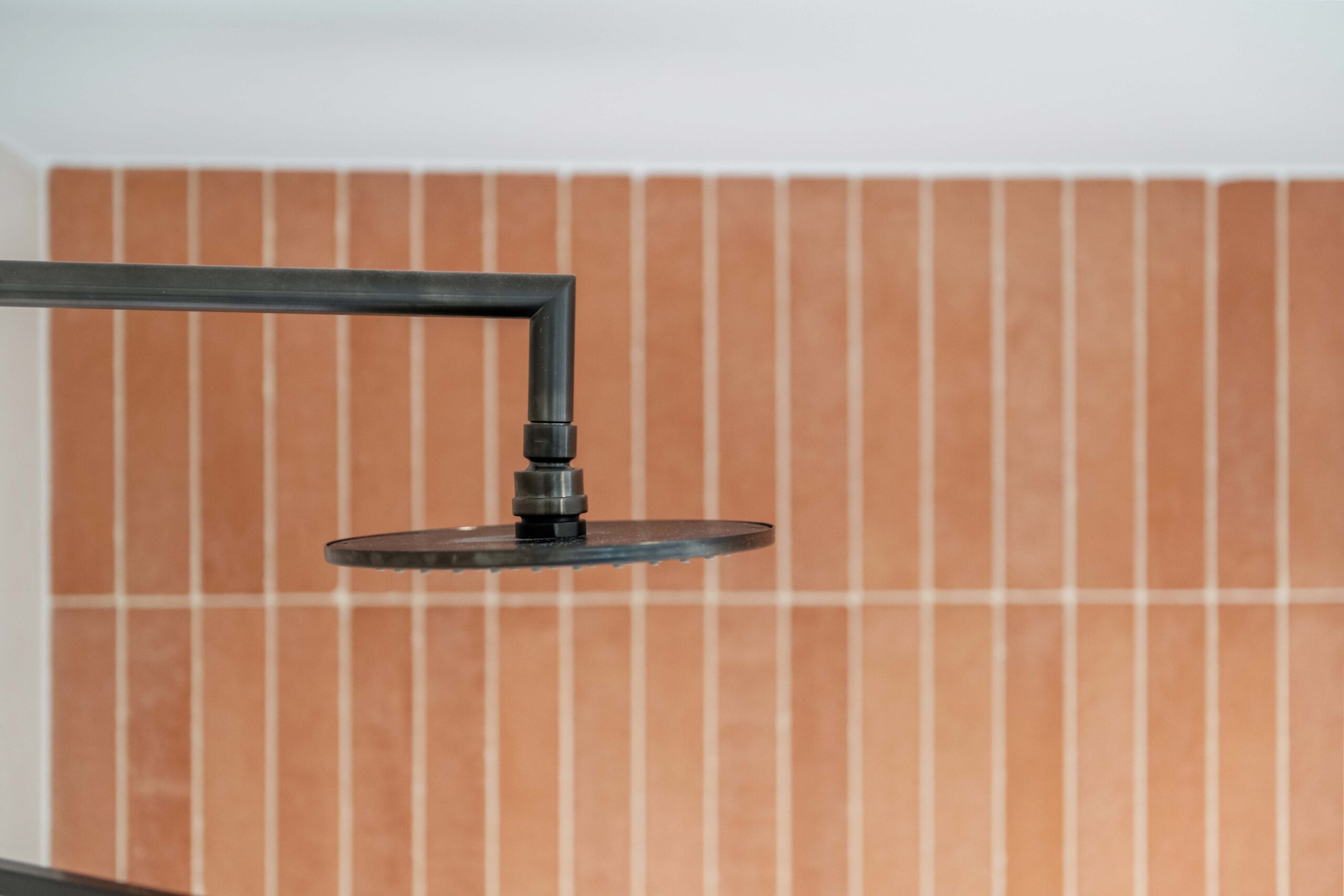 Deze badkamerrenovatie springt in het oog dankzij de prachtige badwand in echte terracotta tegels. De natuurlijke kleurenschakering van de tegels vormt een warm contrast met de donkergekleurde kranen. Omdat terracotta poreus is, werden de tegels zorgvuldig behandeld tegen vocht om hun schoonheid te behouden.
